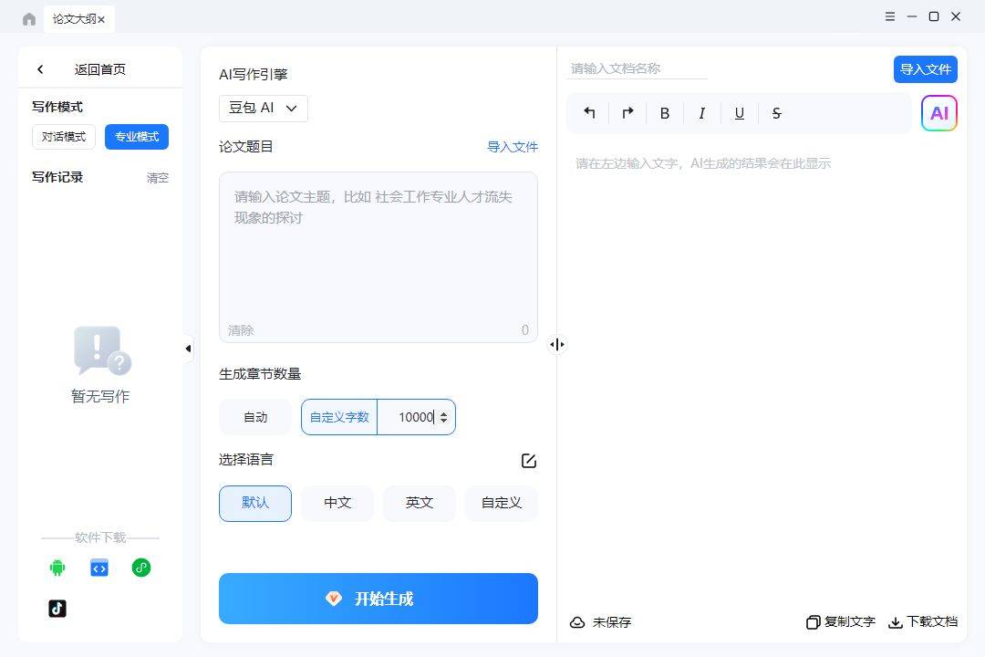 ③专业模式:输入论文主题,文章字数、默认语言等,一键就能生成英文论文大纲了~